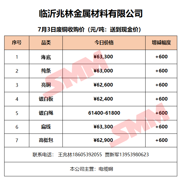 7月3日临沂兆林金属 废铜收购报价