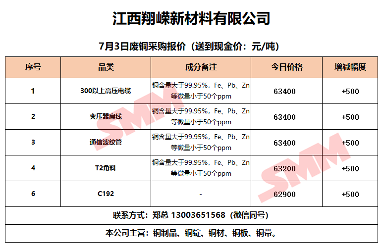 7月3日江西翔嵘新材料 废铜采购报价