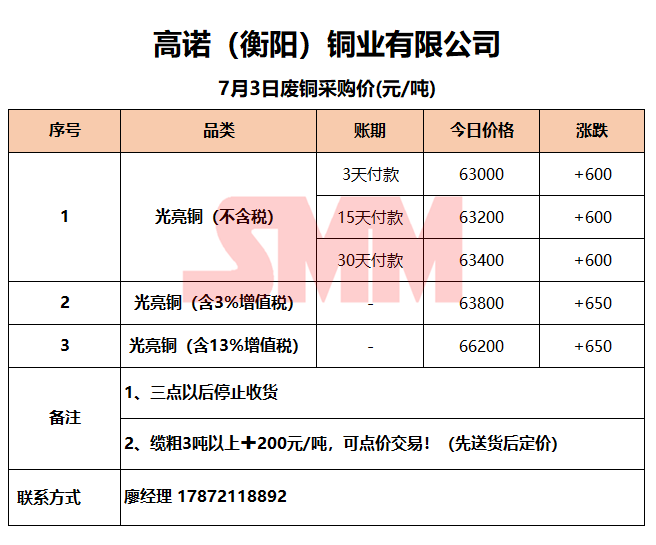 7月3日高诺(衡阳)铜业 废铜采购报价
