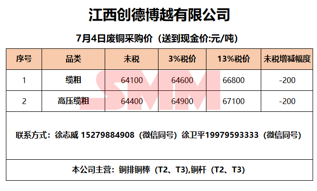 7月4日江西创德博越 废铜采购报价