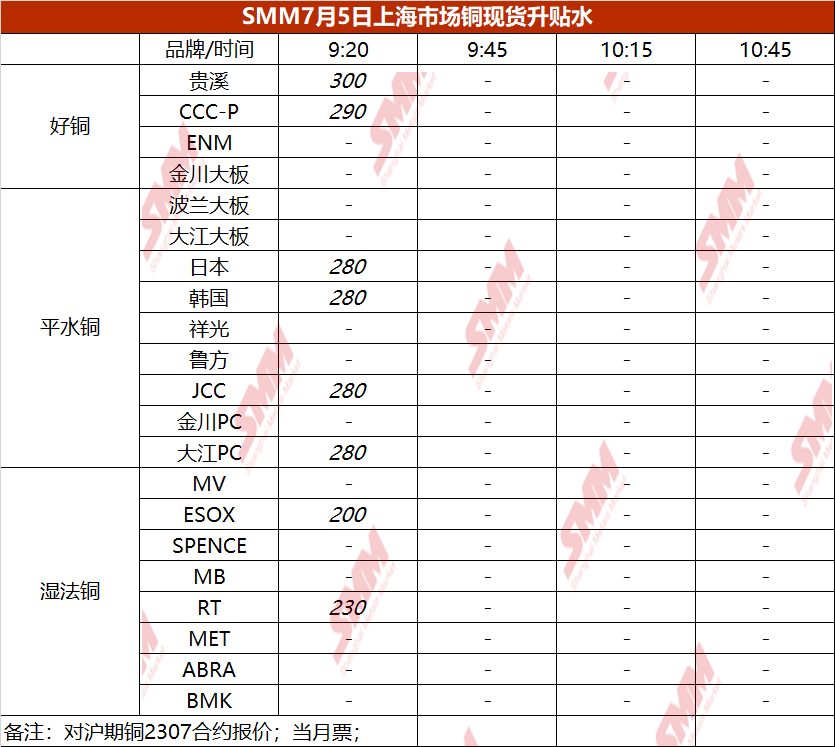 7月5日上海市场铜现货升贴水(第一时段)【SMM价格】