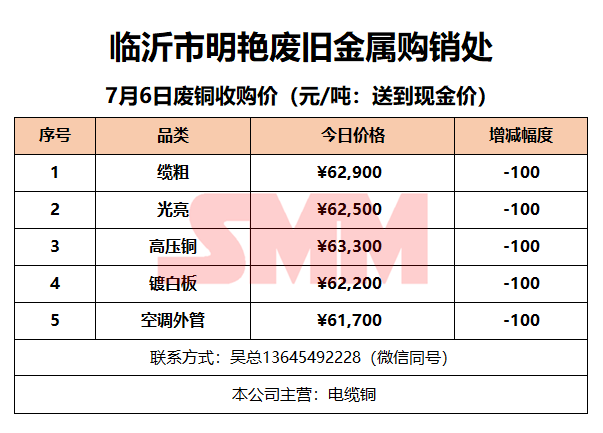 7月6日临沂明艳废旧金属 废铜收购报价