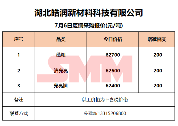 7月6日湖北皓润 废铜采购报价