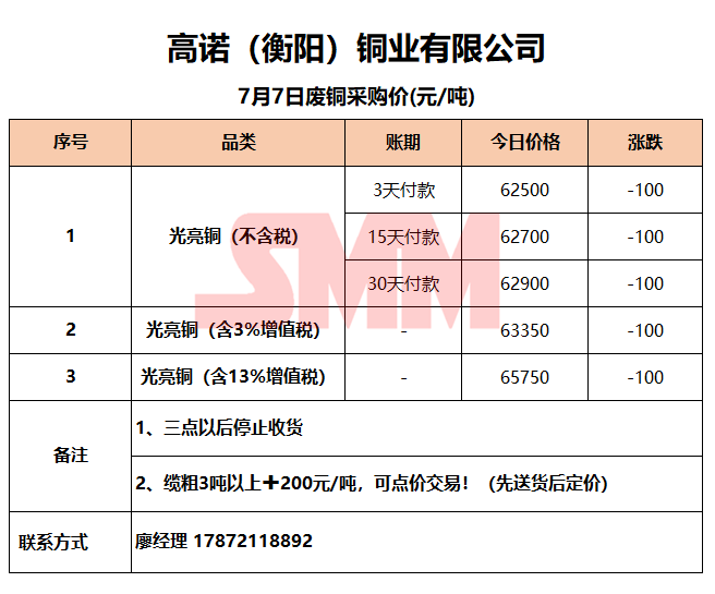 7月7日高诺(衡阳)铜业 废铜采购报价
