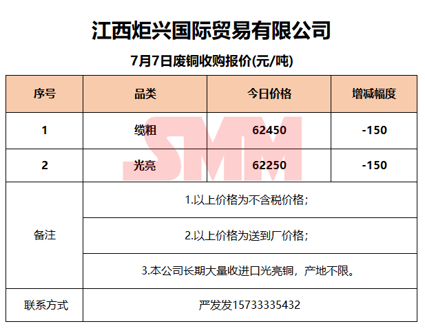 7月7日江西炬兴 废铜收购报价