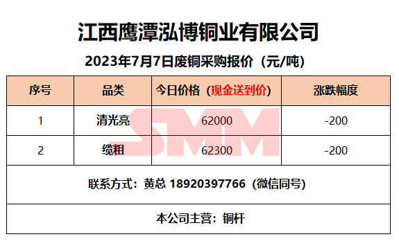 7月7日江西鹰潭泓博铜业 废铜采购报价