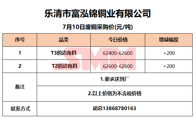 7月10日乐清富泓锦 废铜采购报价