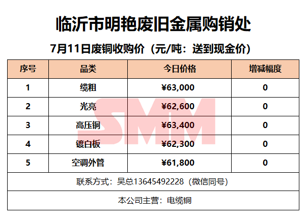 7月11日临沂明艳废旧金属 废铜收购报价