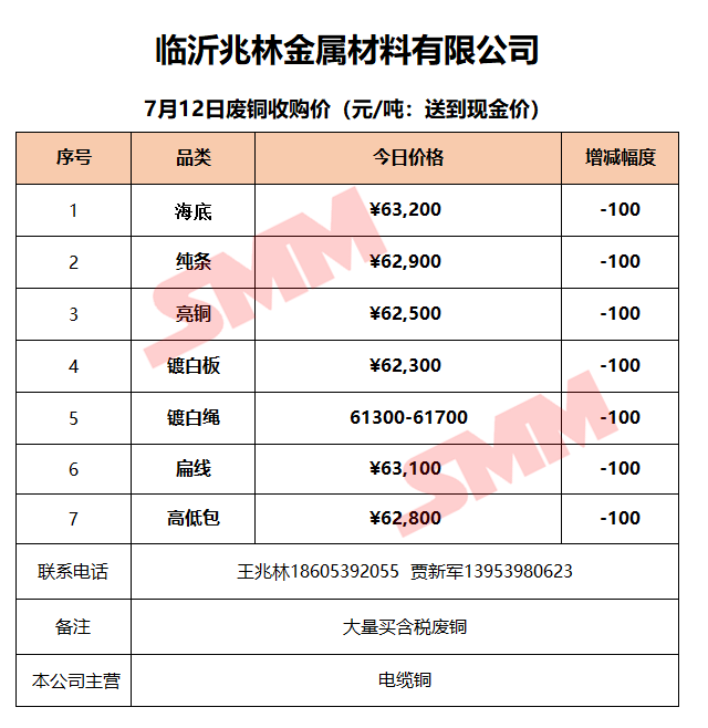 7月12日临沂兆林金属 废铜收购报价