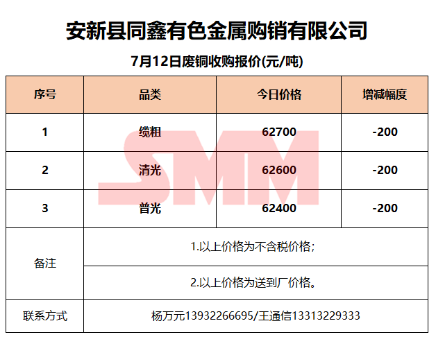 7月12日安新同鑫 废铜收购报价