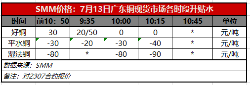 7月13日广东铜现货市场各时段升贴水(第三时段10:15)【SMM价格】