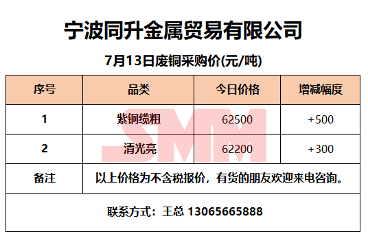 7月13日同升金属 废铜采购报价