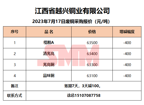 今日江西越兴,废铜采购报价已更新,有货的朋友欢迎联系我们!