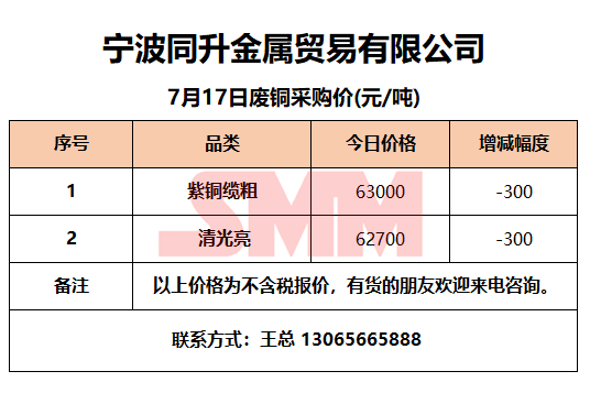 今日宁波同升金属,废铜采购报价已更新,有货的朋友欢迎联系我们!