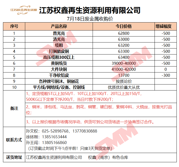 今日江苏权鑫再生资源利用有限公司 废金属收购报价已更新,有货的朋友欢迎联系我们!