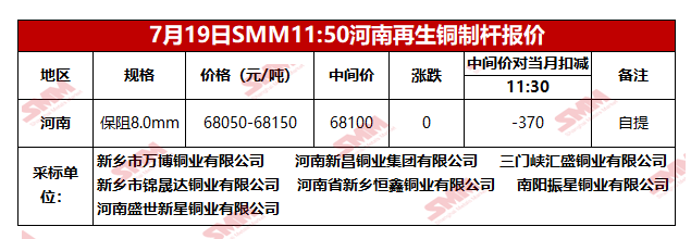 7月19日SMM河南地区再生铜制杆报价
