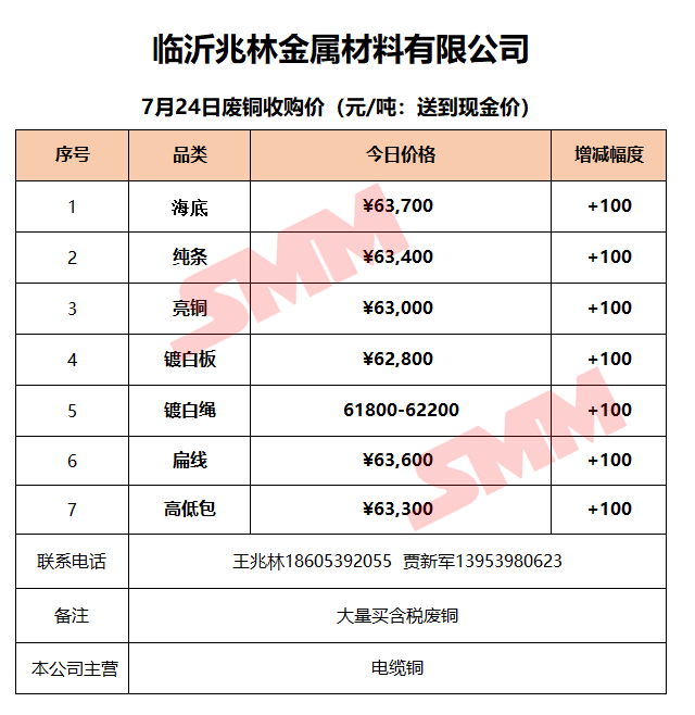 7月24日临沂兆林金属 废铜收购报价