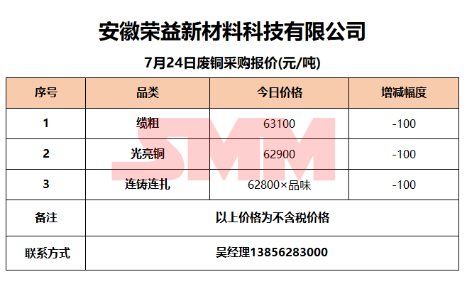 7月24日安徽荣益 废铜采购报价
