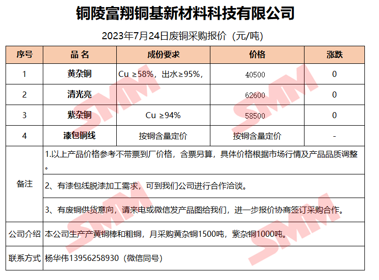 7月24日铜陵富翔 废铜采购报价