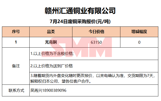 7月24日赣州汇通 废铜采购报价
