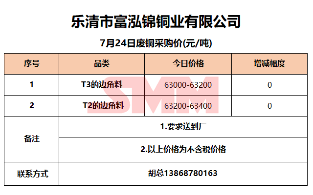 7月24日乐清富泓锦 废铜采购报价