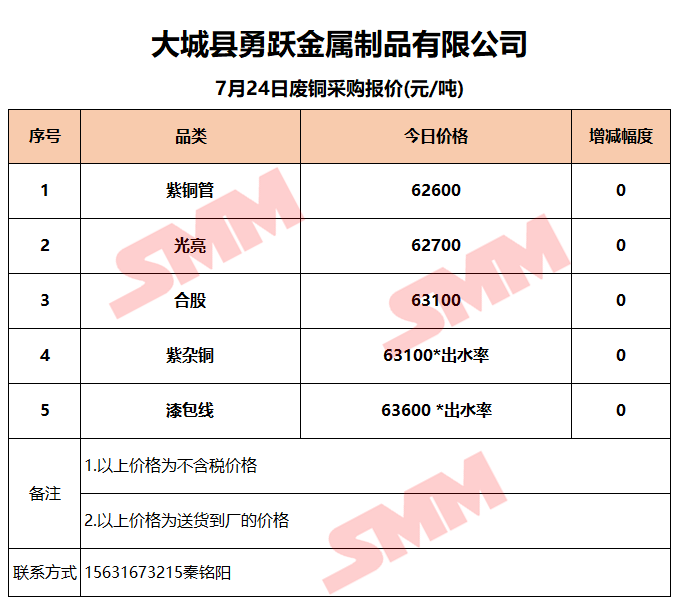 7月24日大城勇跃 废铜采购报价