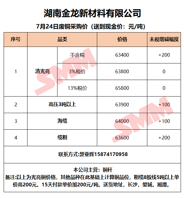 7月24日湖南金龙 废铜采购报价