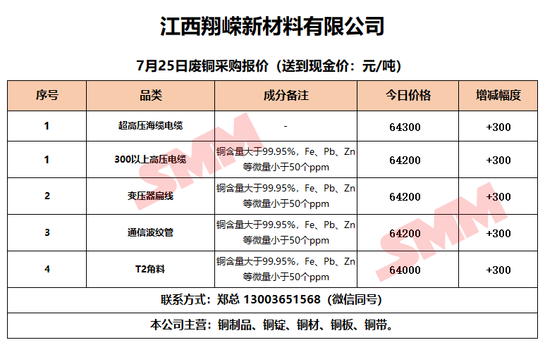7月25日江西翔嵘新材料 废铜采购报价