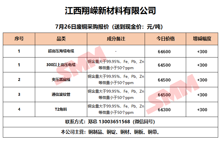 7月26日江西翔嵘新材料 废铜采购报价