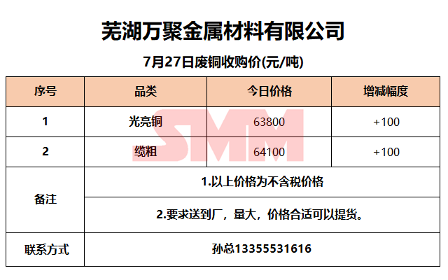 7月27日芜湖万聚金属 废铜收购报价