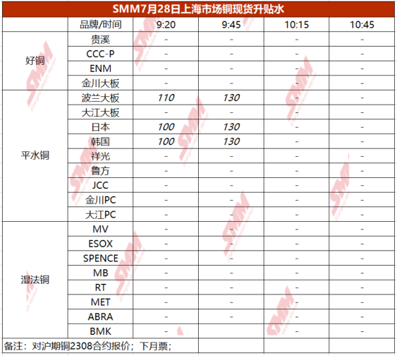 7月28日上海市场铜现货升贴水(第二时段)【SMM价格】