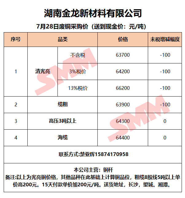 7月28日湖南金龙 废铜采购报价