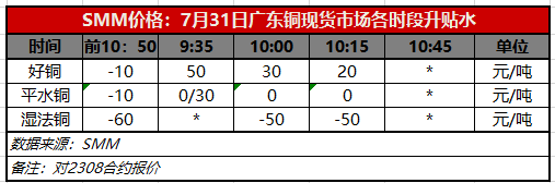 7月31日广东铜现货市场各时段升贴水(第三时段10:15)【SMM价格】