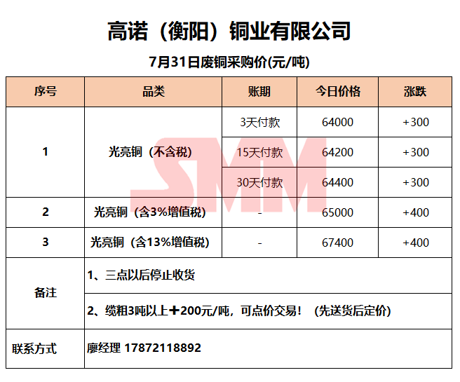 7月31日高诺(衡阳)铜业 废铜采购报价