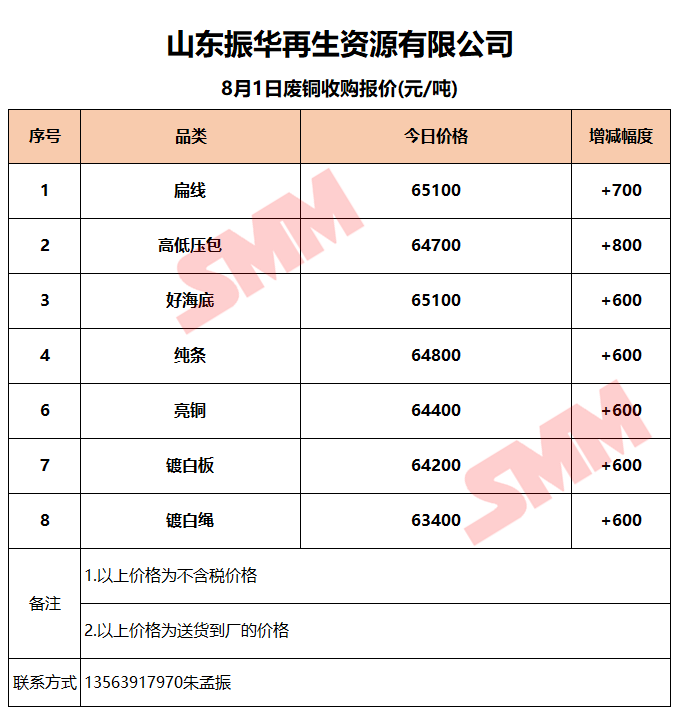 8月1日山东振华 废铜收购报价
