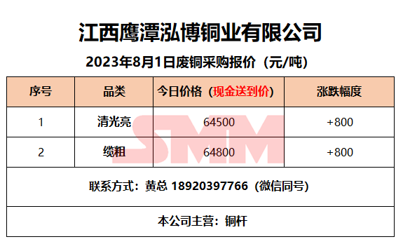 8月1日江西鹰潭泓博铜业 废铜采购报价