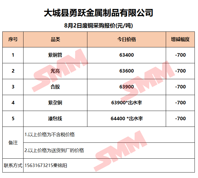 8月2日大城勇跃 废铜采购报价