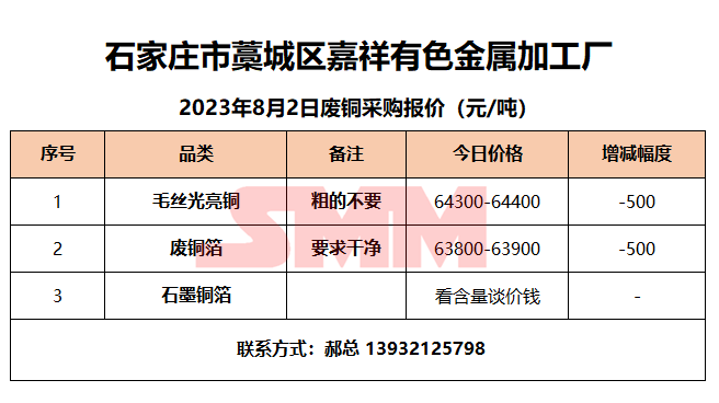 8月2日嘉祥有色金属 废铜采购报价