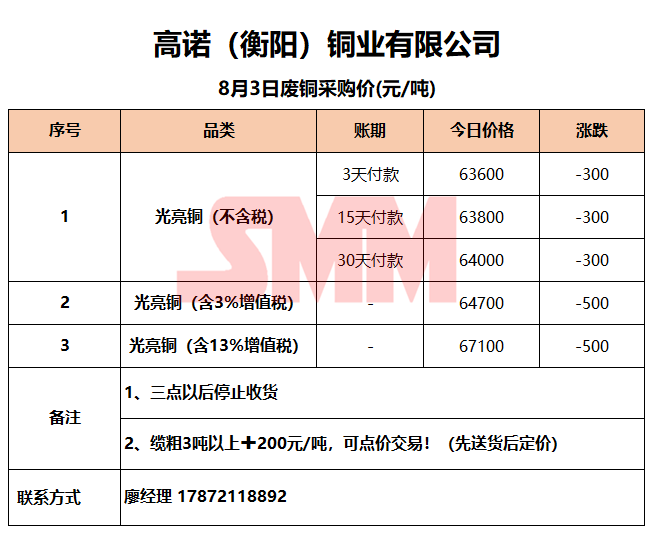 8月3日高诺(衡阳)铜业 废铜采购报价