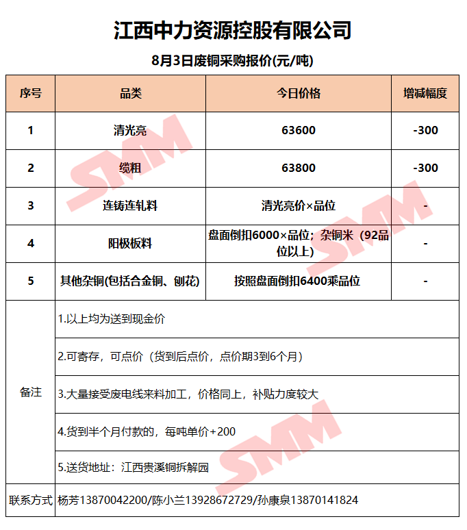 8月3日江西中力 废铜采购报价