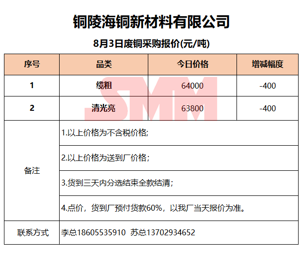 8月3日铜陵海铜 废铜采购报价