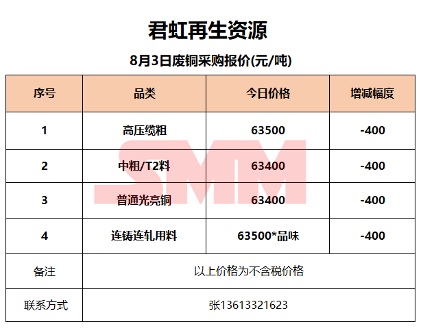 8月3日君虹再生资源 废铜收购报价