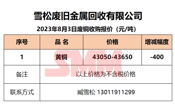 8月3日雪松废旧 废铜收购报价
