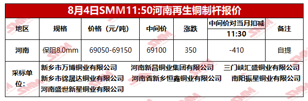 8月4日SMM河北地区再生铜制杆报价