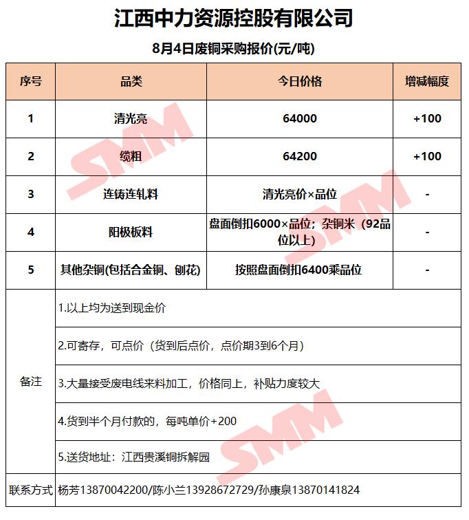 8月4日江西中力 废铜采购报价