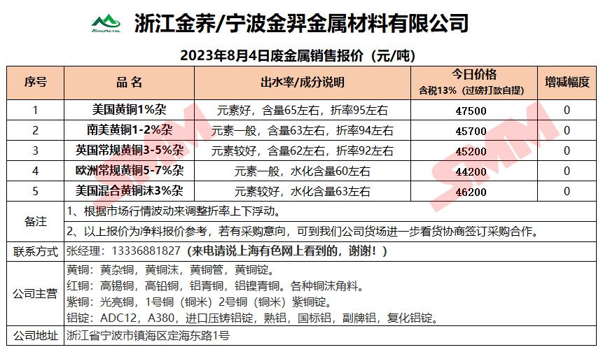8月4日浙江金荞/宁波金羿 废铜销售报价