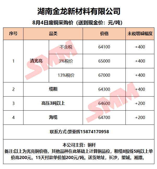 8月4日湖南金龙 废铜采购报价