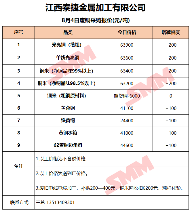8月4日江西泰捷 废铜采购报价