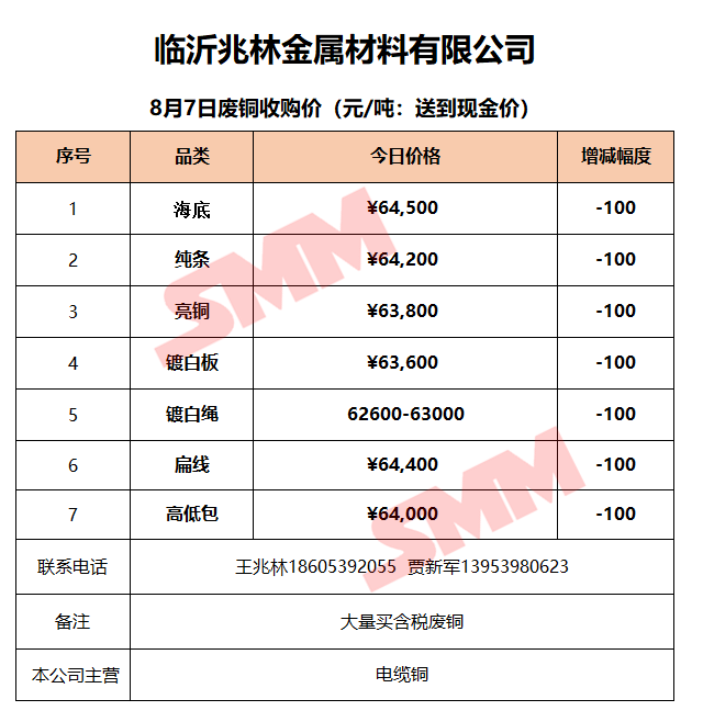 8月7日临沂兆林金属 废铜收购报价