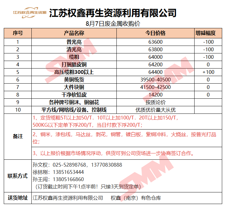 8月7日江苏权鑫 废金属收购报价